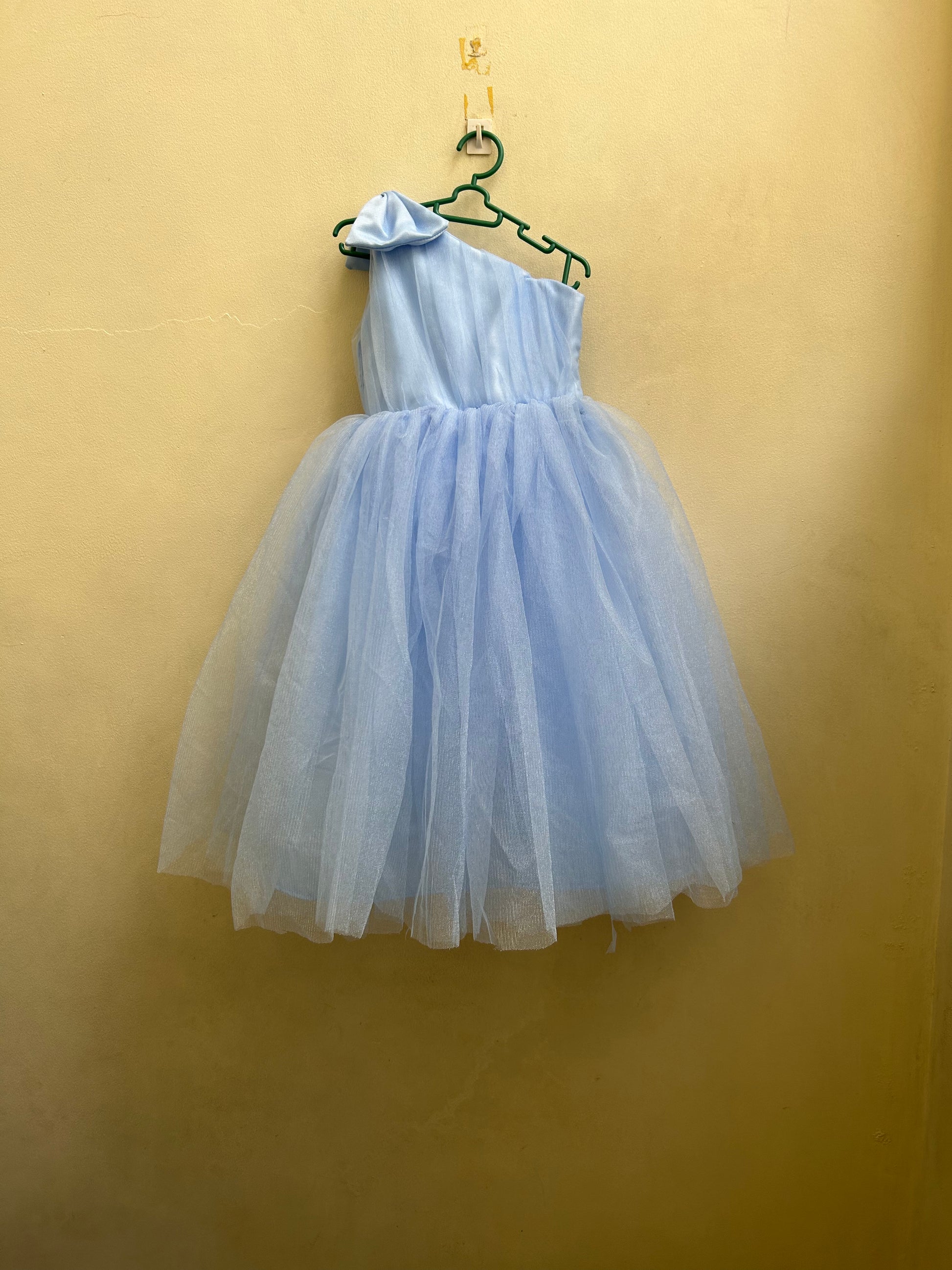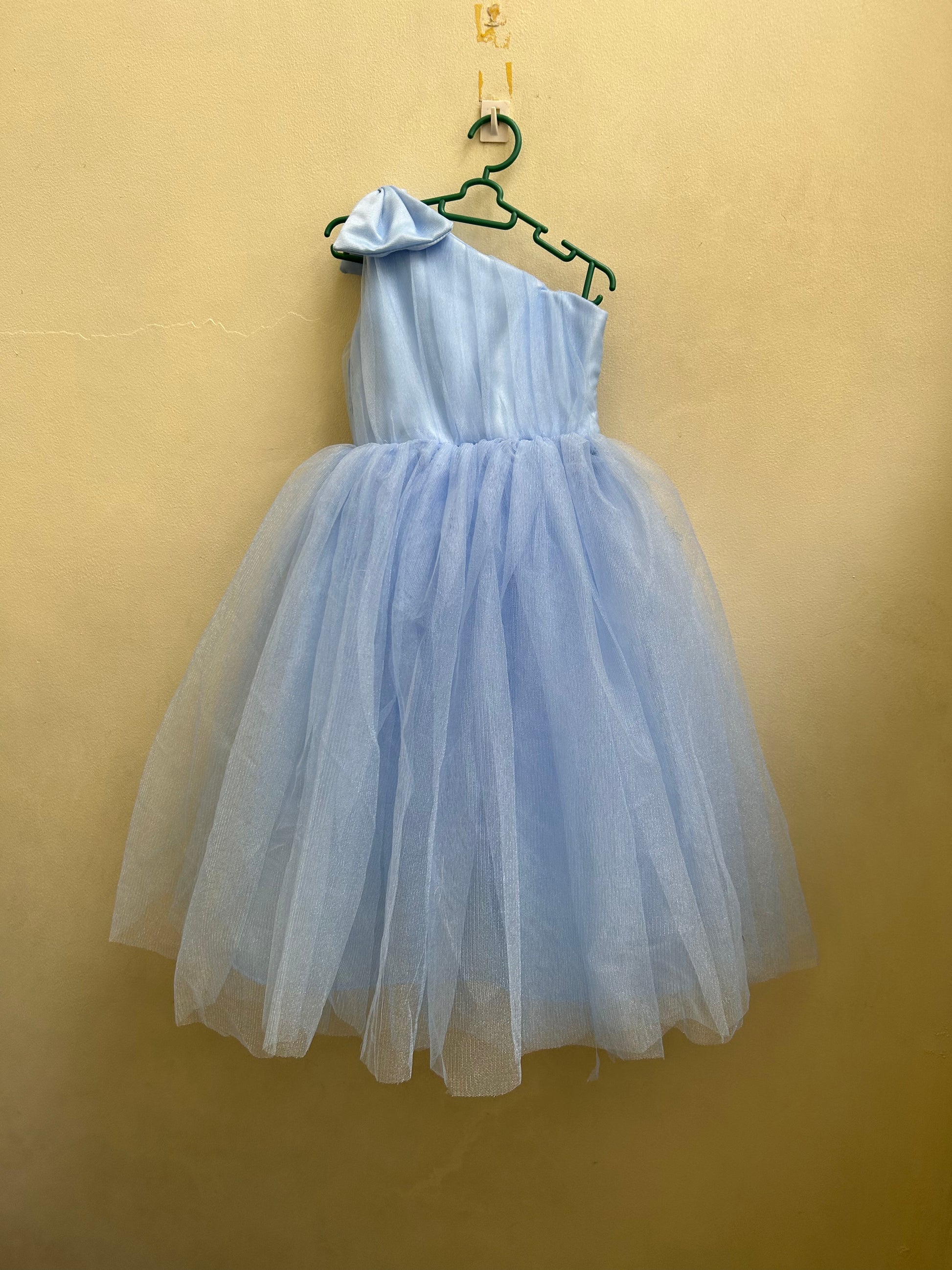 This stunning one-shoulder gown is perfect for any special occasion. The top features a single strap that crosses over the shoulder and a delicate bow by the shoulder. The skirt is made from layers of soft tulle that create a full and flowing silhouette, perfect for twirling and dancing.