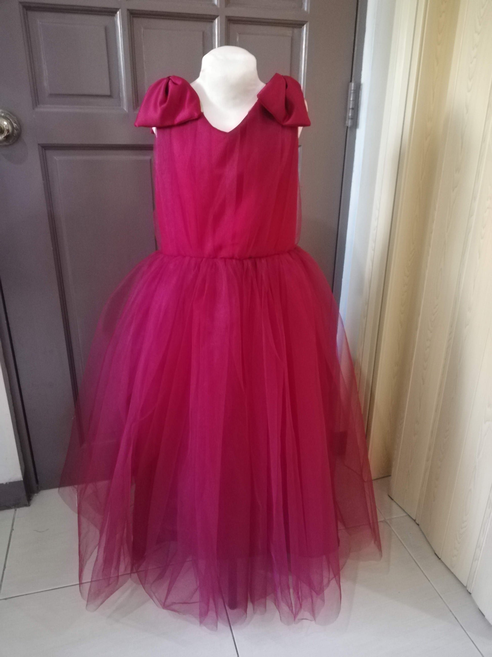 The top of the gown features beautiful ruching detail, adding texture and depth to the bodice. The shoulders are adorned with delicate ribbon bows, adding a touch of elegance and charm. The skirt is made of layers of soft tulle, creating a full and flowing silhouette that will make your child feel like they are floating on air.