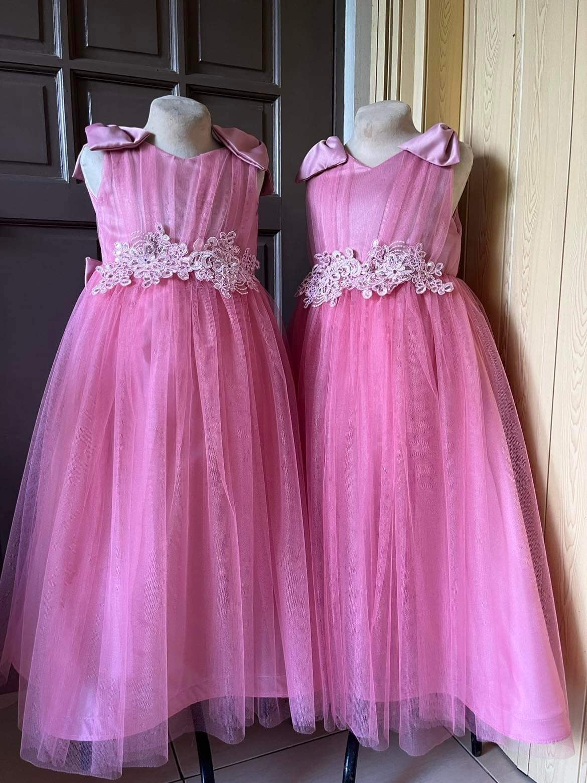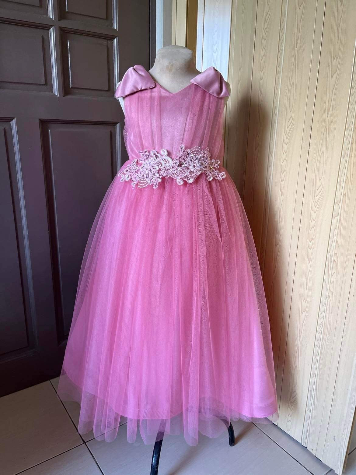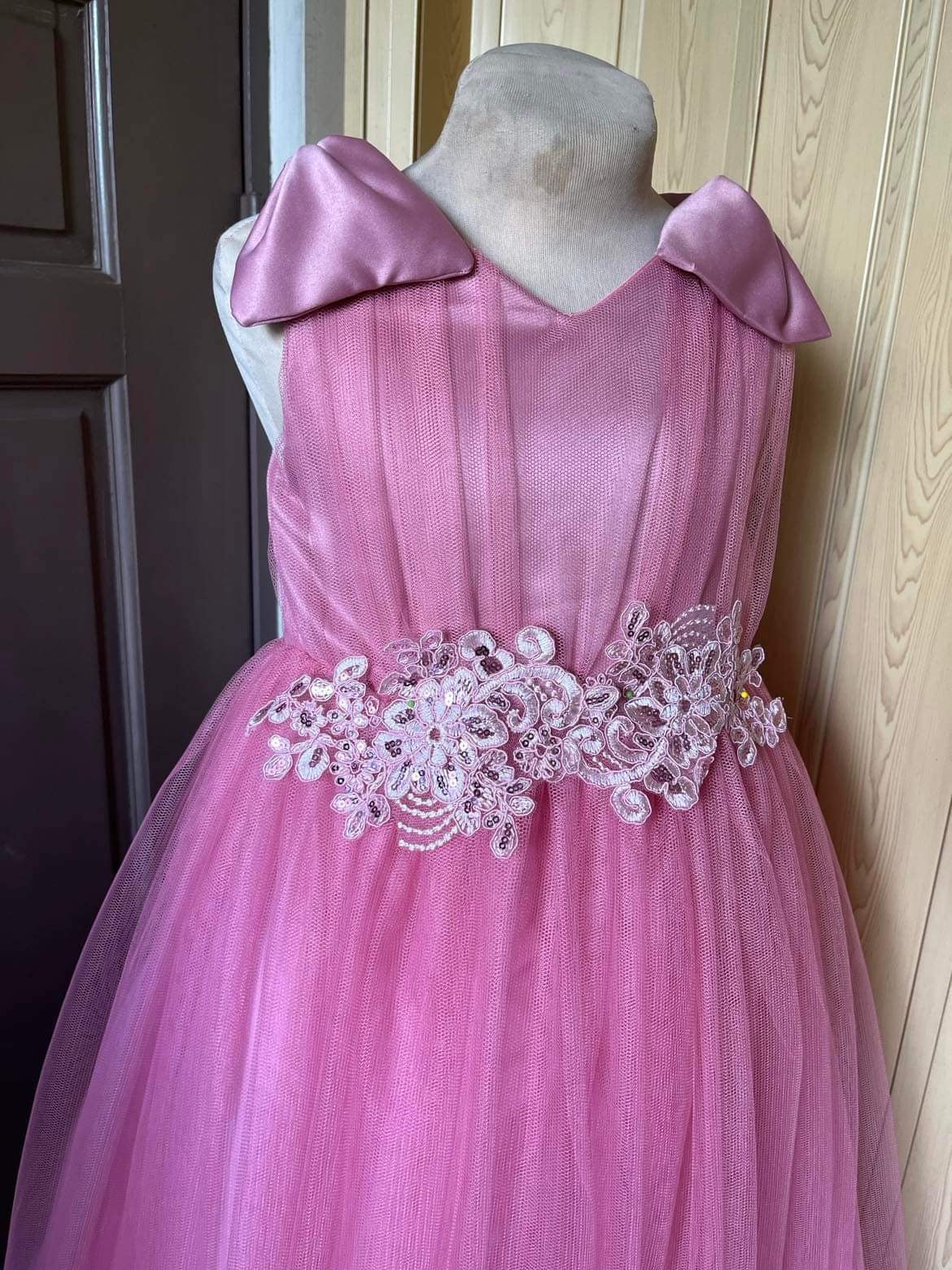 The top of the gown features beautiful ruching detail, adding texture and depth to the bodice. The shoulders are adorned with delicate ribbon bows, adding a touch of elegance and charm. The skirt is made of layers of soft tulle, creating a full and flowing silhouette that will make your child feel like they are floating on air.