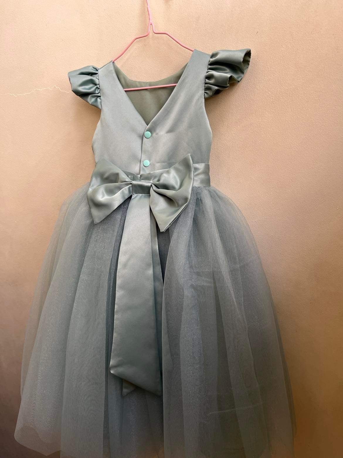 Back: low V back, snaps closure, oversized ribbon, belt (optional)