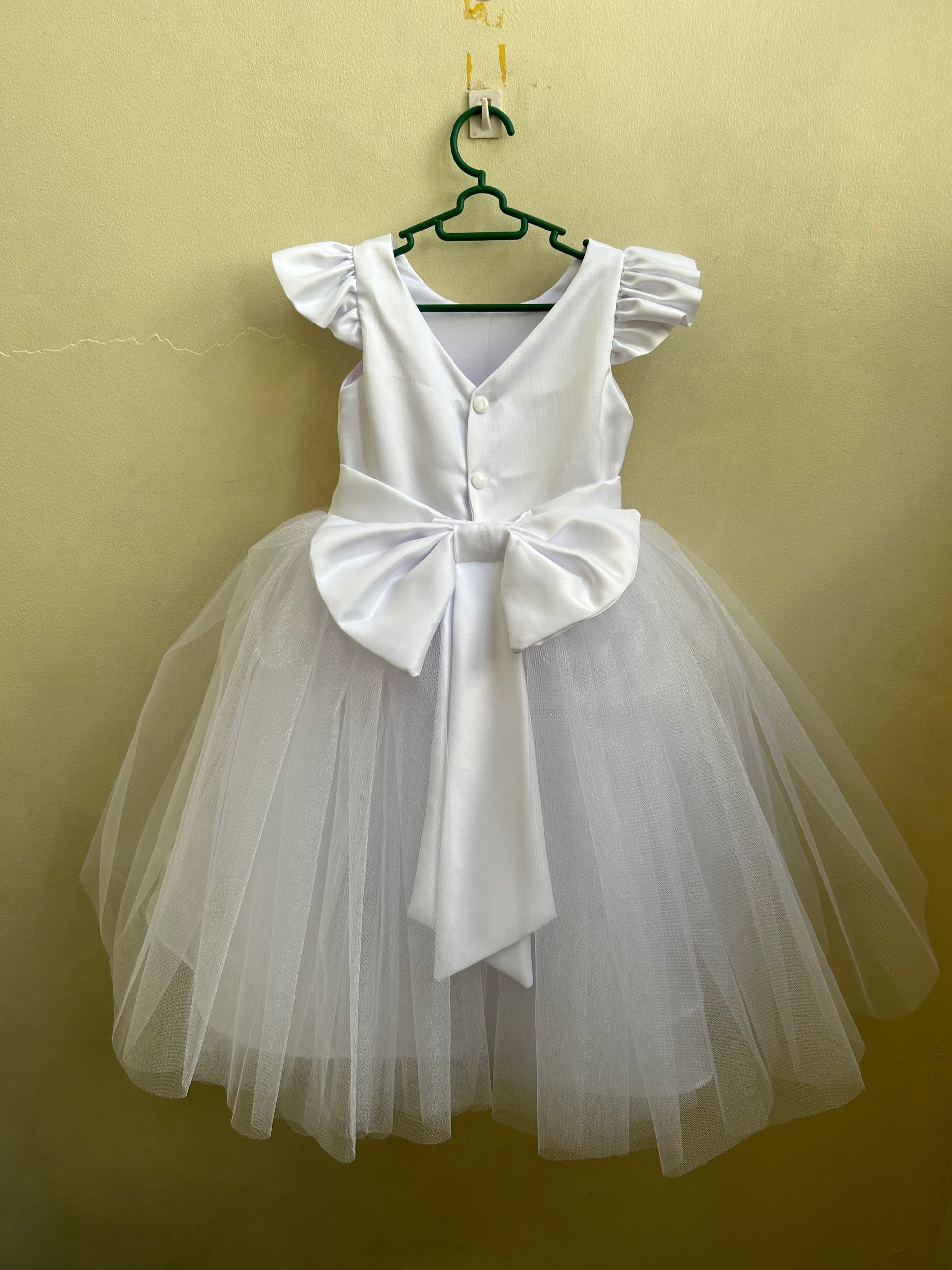 Back: low V back, snaps closure, oversized ribbon, belt (optional)