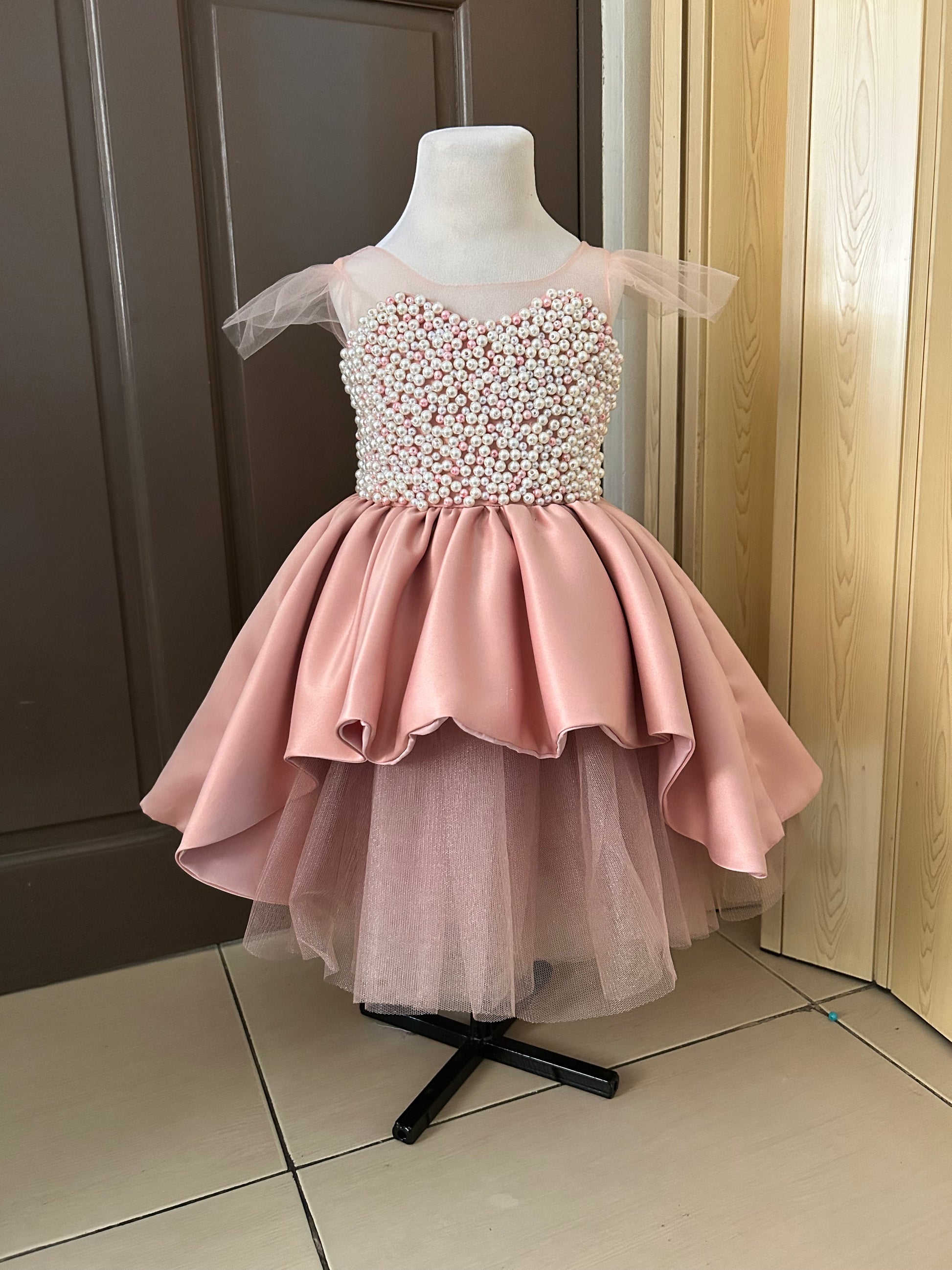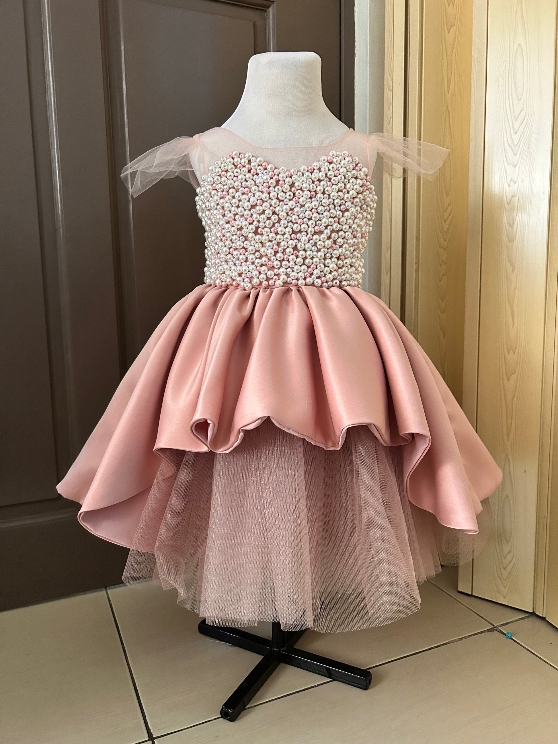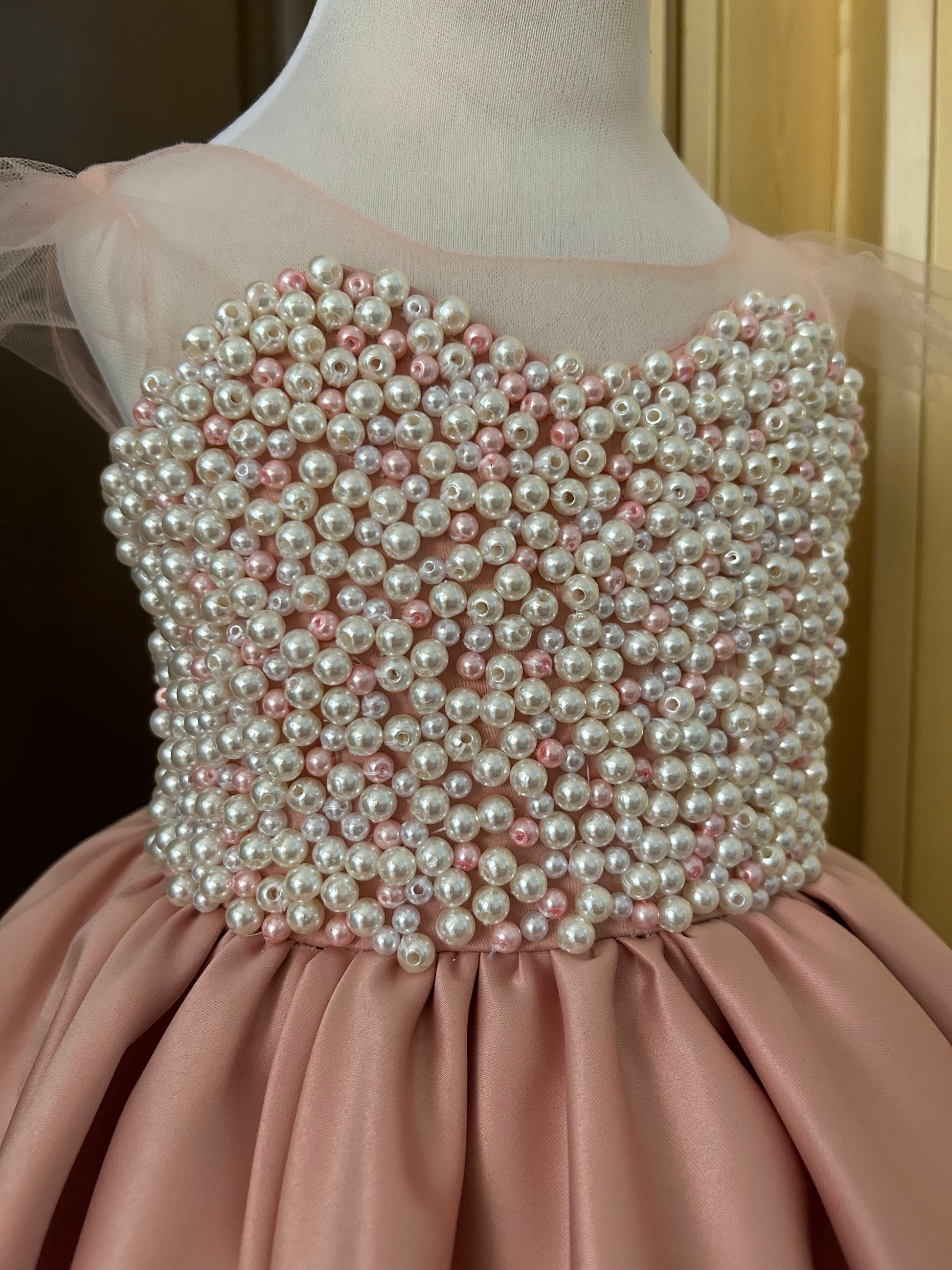Make your little girl feel like a princess in this stunning gown featuring a full pearl studded bodice and a layered skirt