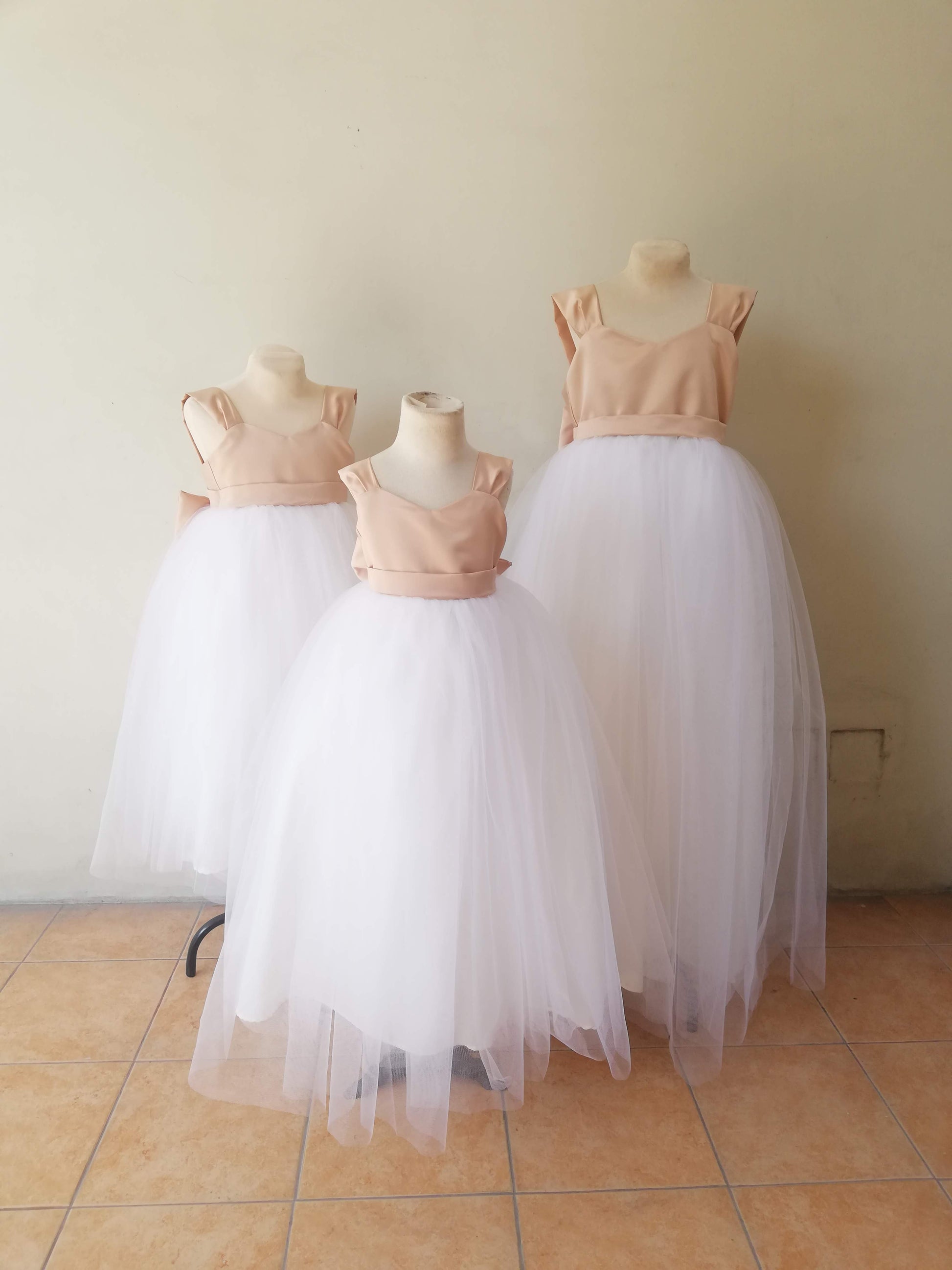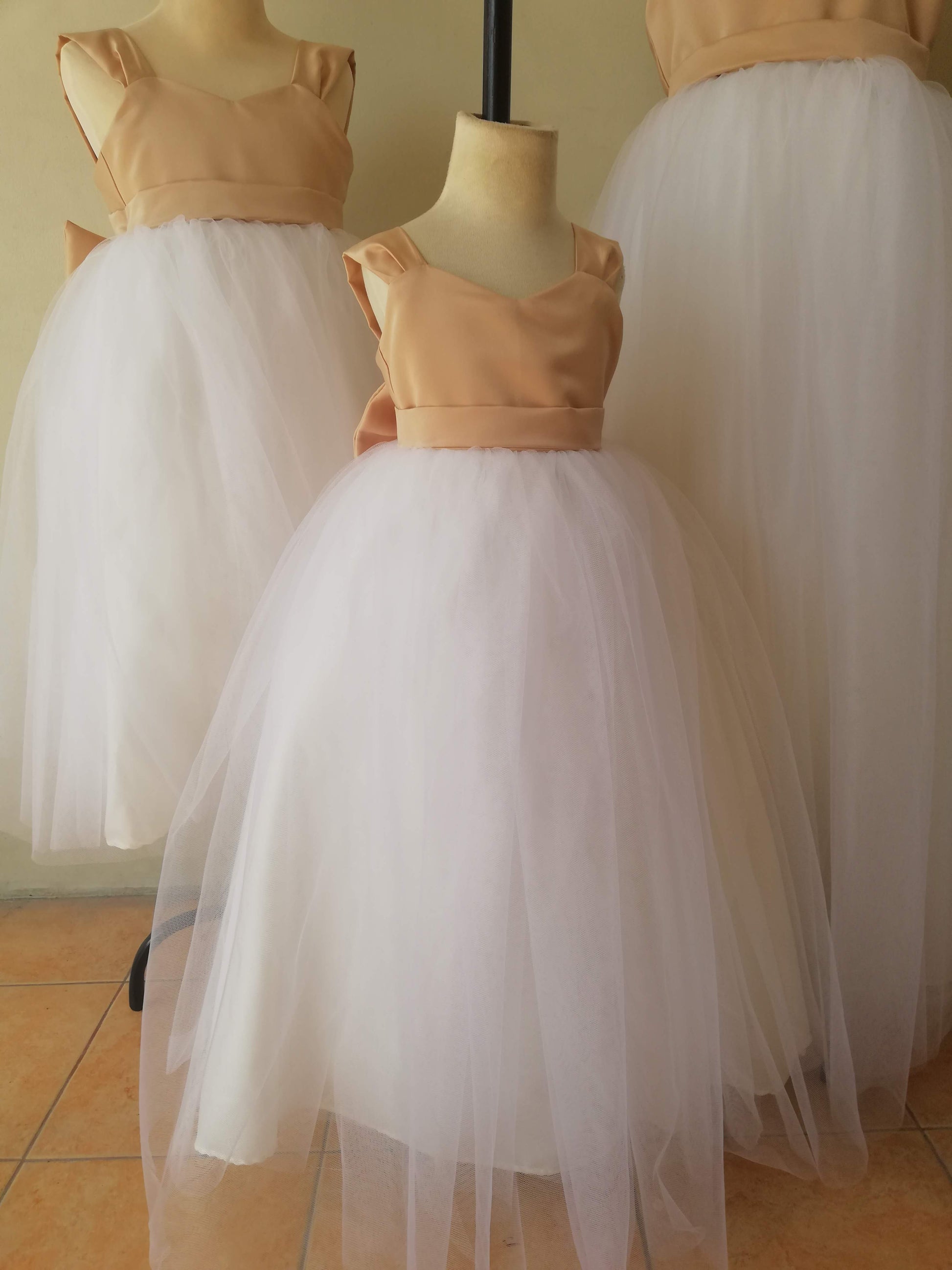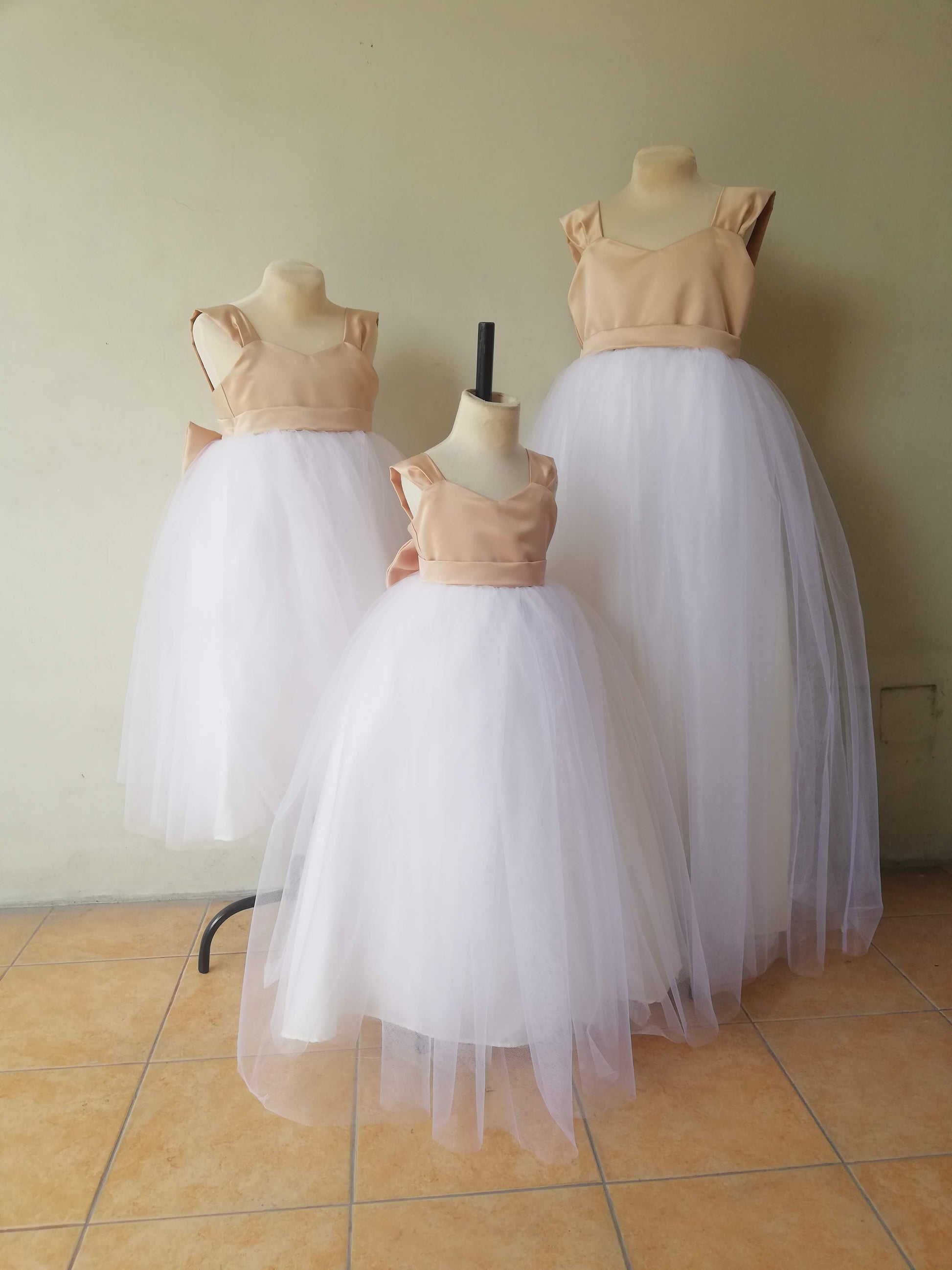 Materials: Satin, Silk for Lining, Tulle Skirt, Built-in Petticoat