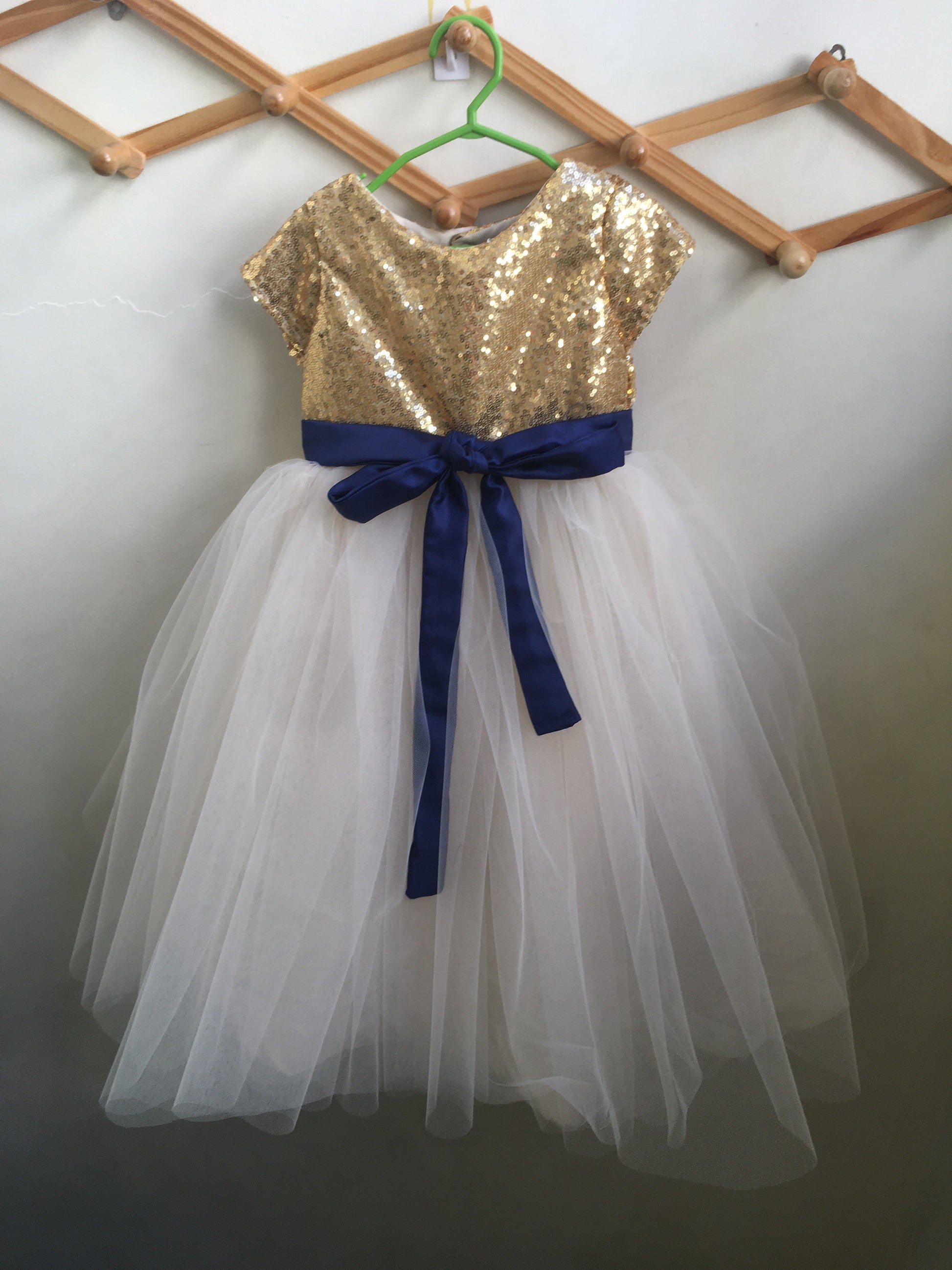 Materials: Sequined fabric in silver, gold, or rose gold, Silk for Lining, Tulle Skirt, Built-in Petticoat