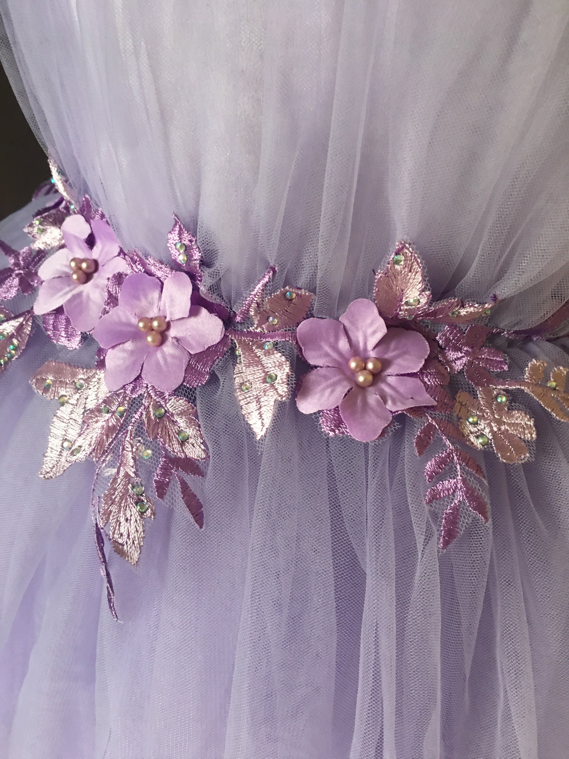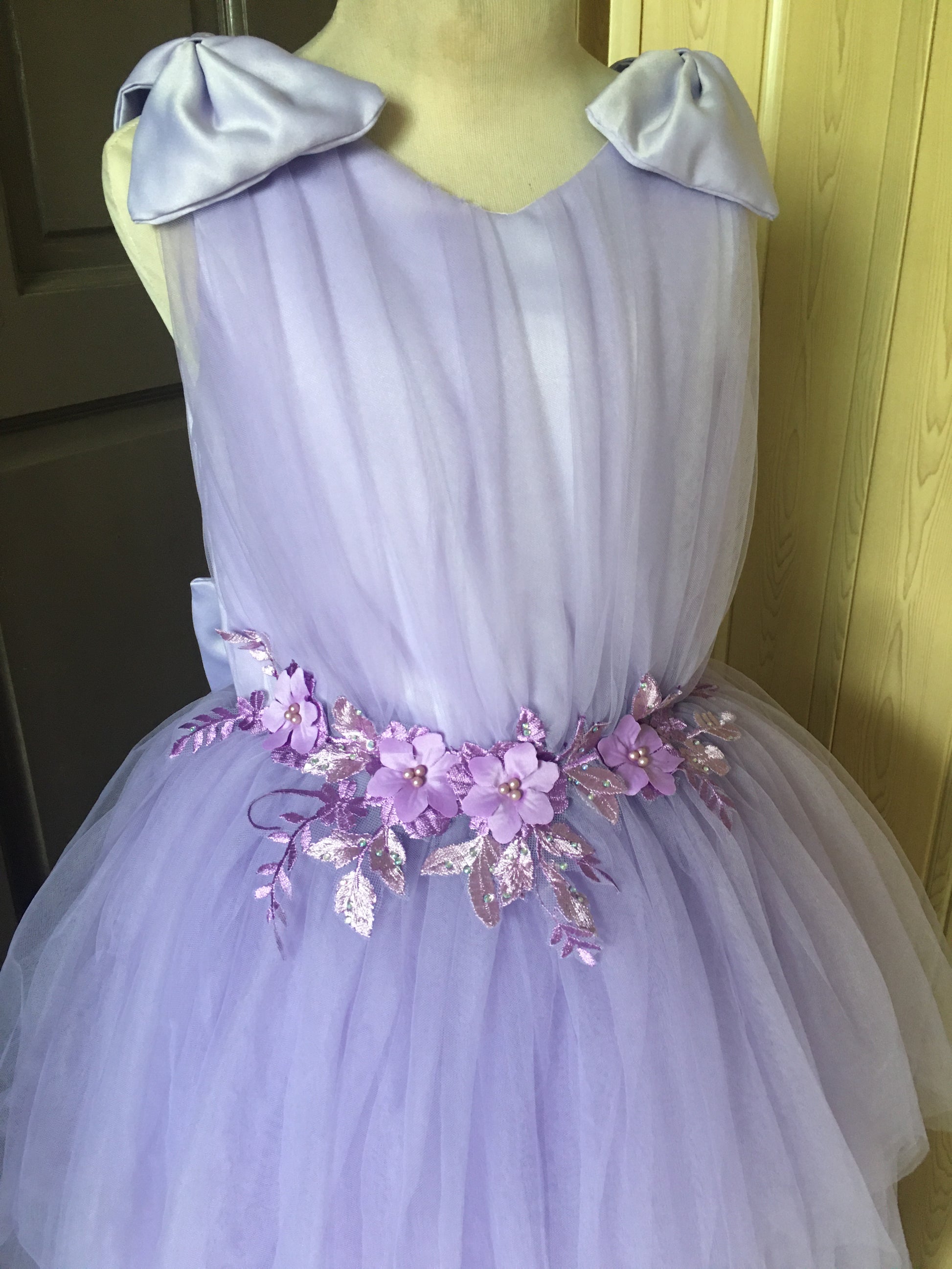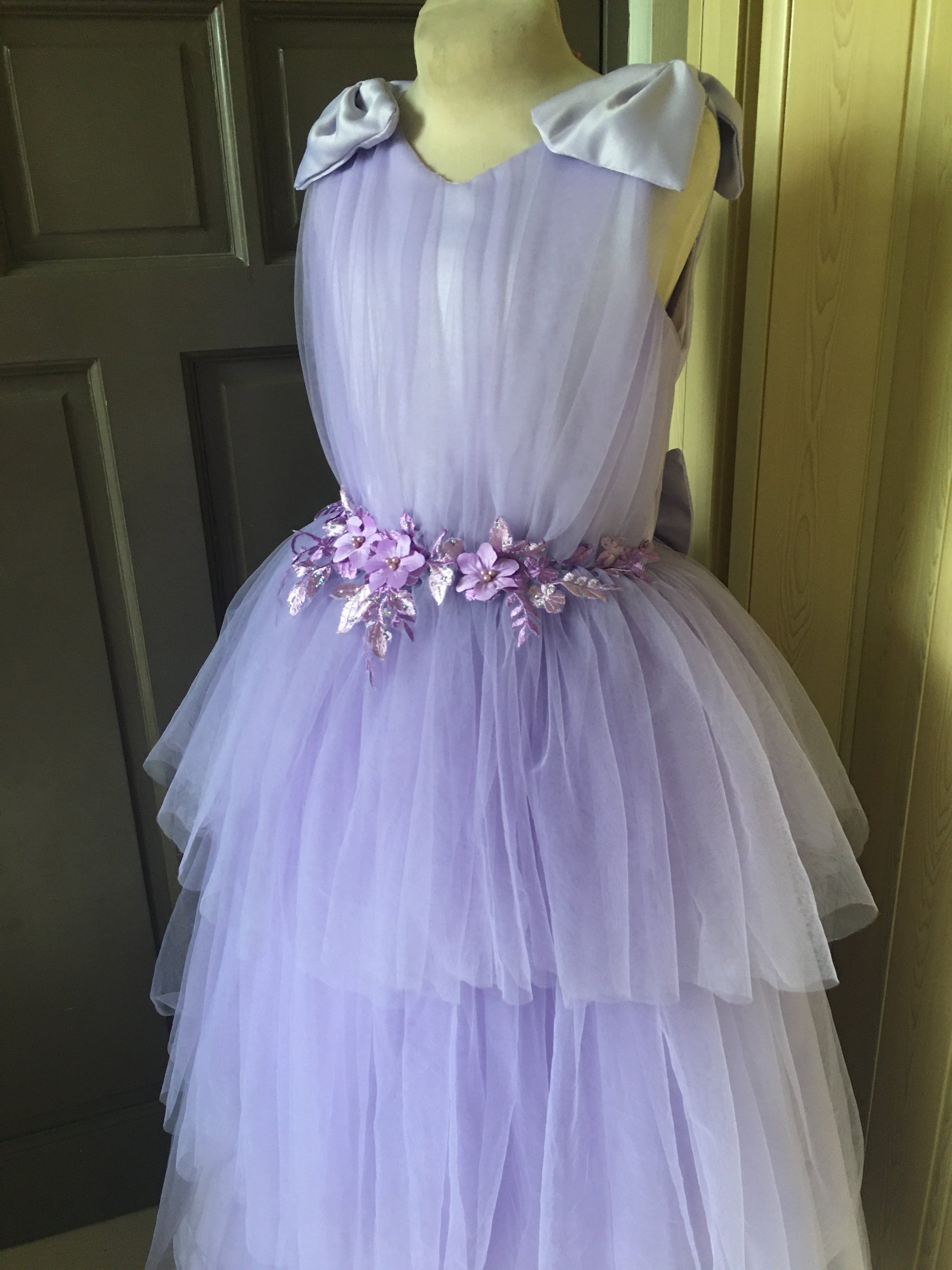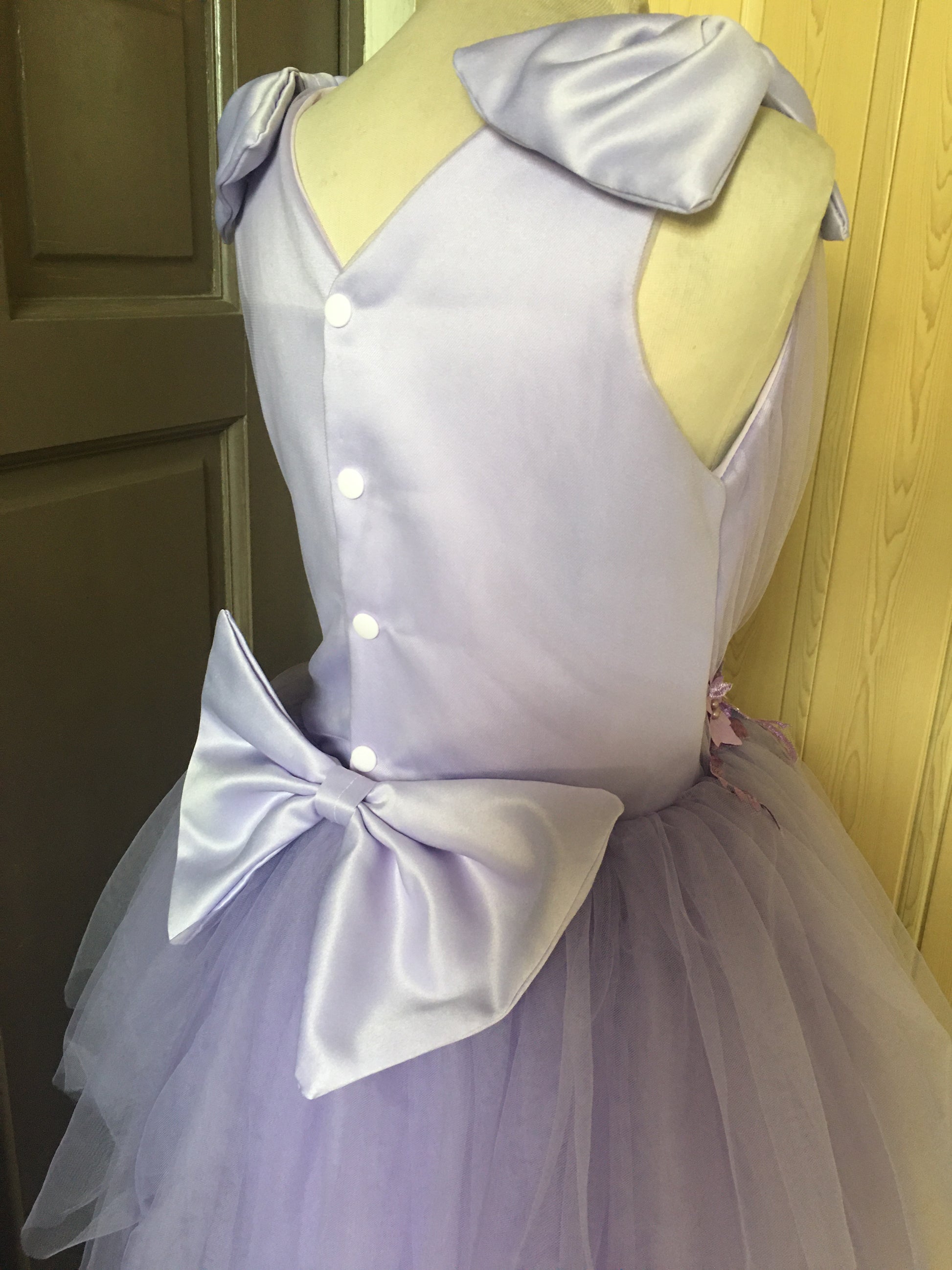 Materials: Satin, Silk for Lining, Tulle Skirt, Built-in Petticoat