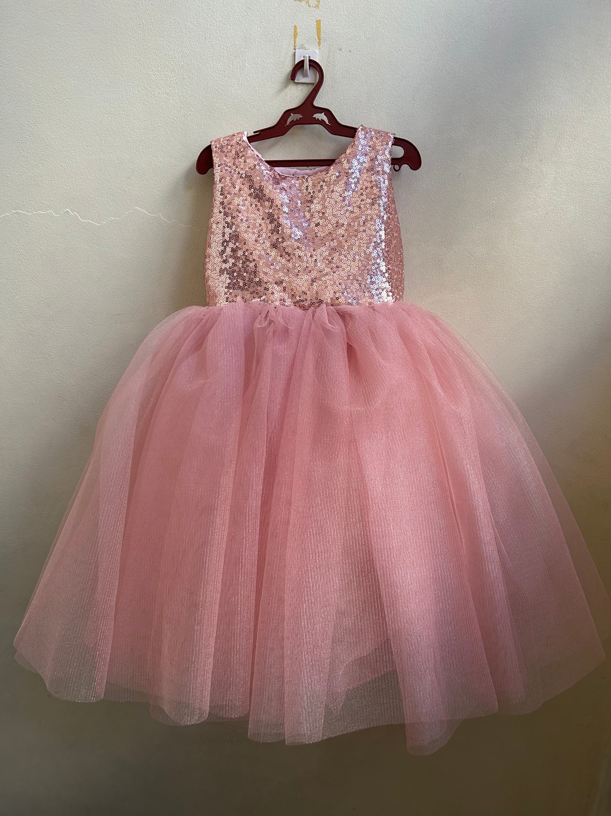 Materials: Sequined fabric in silver, gold, or rose gold, Silk for Lining, Tulle Skirt, Built-in Petticoat