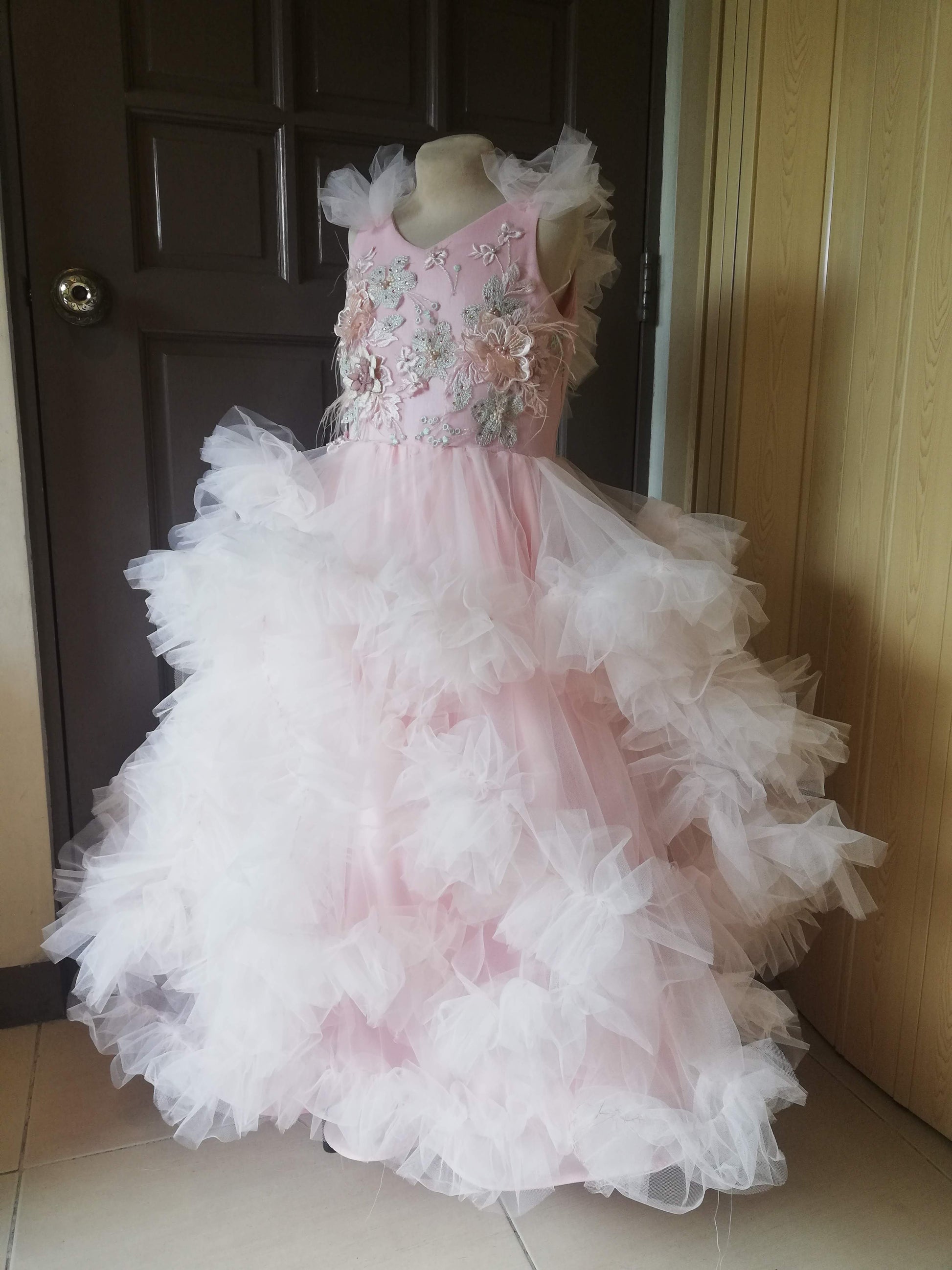 Make your little princess feel like a fairy tale character with this gown. The dress is perfect for special occasions like weddings, proms, birthdays, and other formal events. The gown is made of high-quality tulle fabric that's soft, light, and comfortable to wear. The dress features a full skirt with voluminous layered ruffles that give it a princess-like appeal.